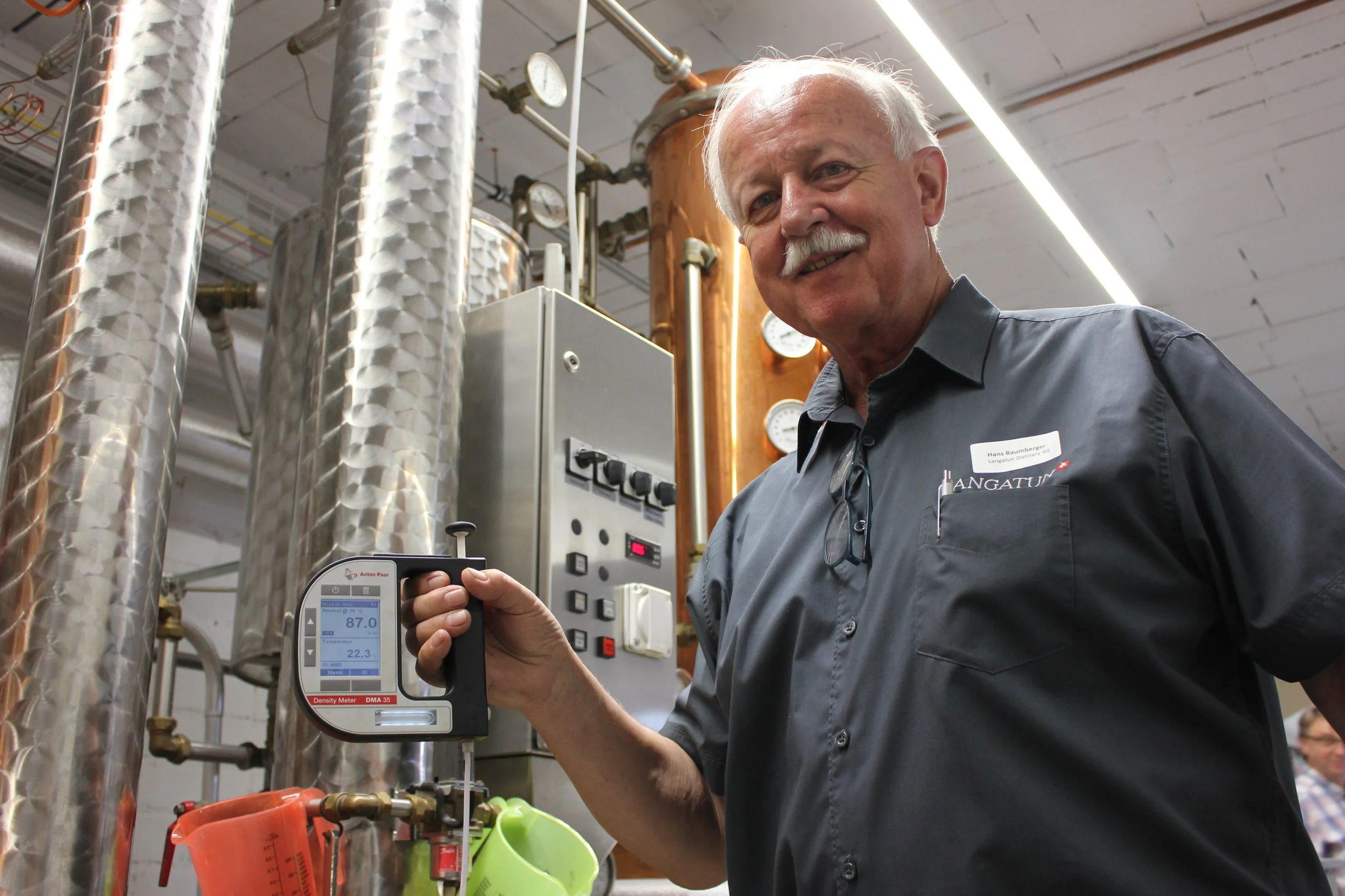 Langatun has a heritage dating back to the 1850s when Han’s grandfather started distilling whisky as a sideline to the Baumberger family brewing business. Distilling was however a casualty of war time rationing during the First World War. The ban on the distillation of barley for alcohol remained in place up until 1999. There doesn’t seem to have been a long campaign to repeal it, more as a consequence of the streamlining of various Swiss alcohol laws in the late 90s, the ban on the distillation of whisky dropped of the statute book. Move into the new millennium and friends asked recently retired Hans to help them establish the Hasli Brewery in Langathal. As a sideline to that project he thought he’d have a go at distilling. So the brewery housed Hans’s Holstein still (only one then). In 2014 a permanent home was found for the distillery, in the Kornhaus, and a second still was added. The Kornhaus is a four hundred year old building built to store crops supplied by local farmers as payment of their taxes. Despite the building’s age, and historic value, in recent decades the local council did not really know what to do with it, so this historic building has lain unused. Today the distillery is housed in a room in the basement. It is small in scale. We used to say Edradour would fit in the Glenfarclas mashtun. With a little bit of exaggeration, Langatun could fit in the Edradour mashtun. But the Holstein stills, with their labyrinth of pipes, valves and gauges look hi-tech compared to what I’m used to. This is symbolised by Han’s electronic hydrometer. No floats in glass tubes, nor studying tables to declare the strength of the new make here. A quick dip and click, and the strength of the new make is confirmed at a mighty 87%.